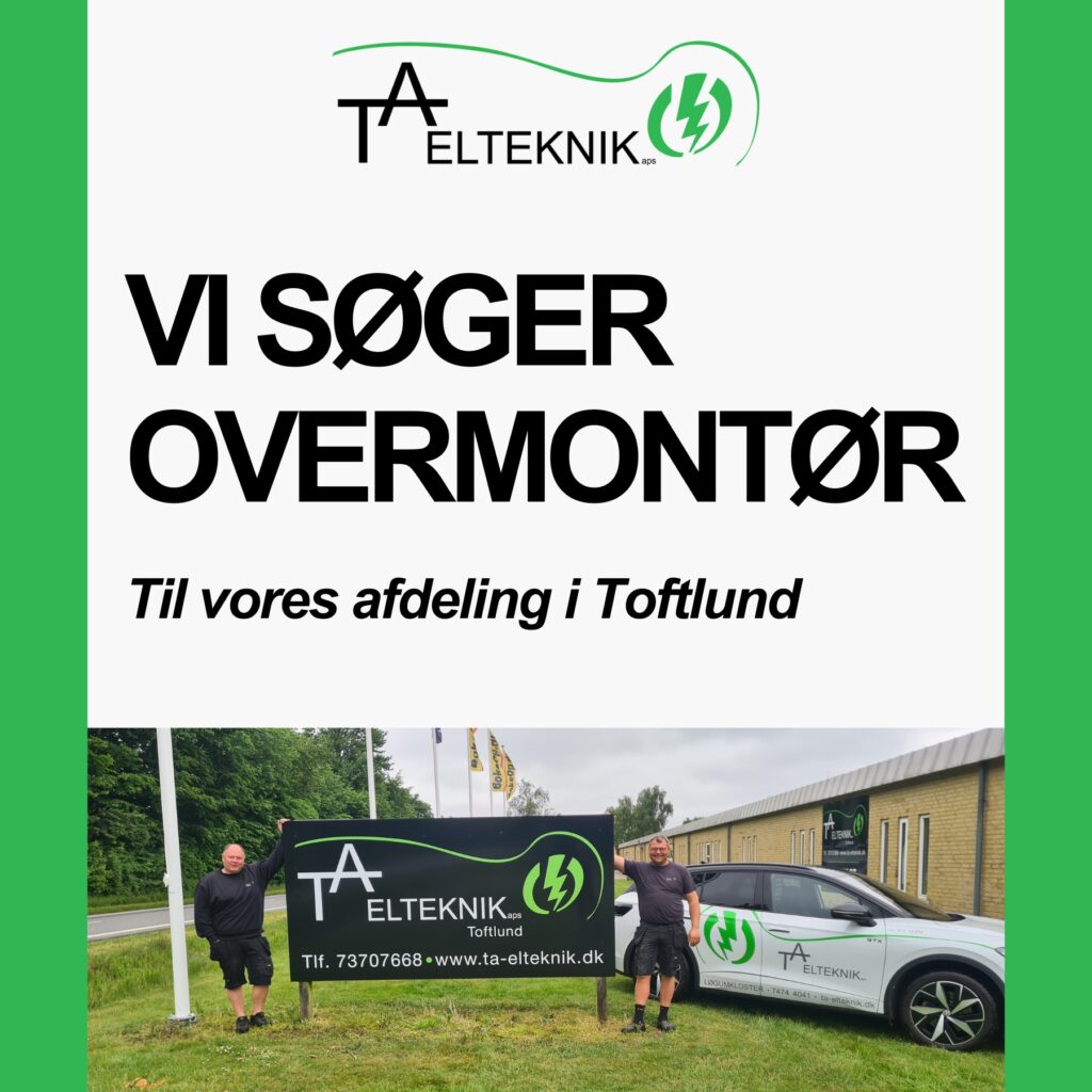 TA-Elteknik har udvidet med en lokal afdeling i Toftlund, og vi søger en overmontør, der både trives med el tekniske opgaver og kan holde overblik over den daglige drift.